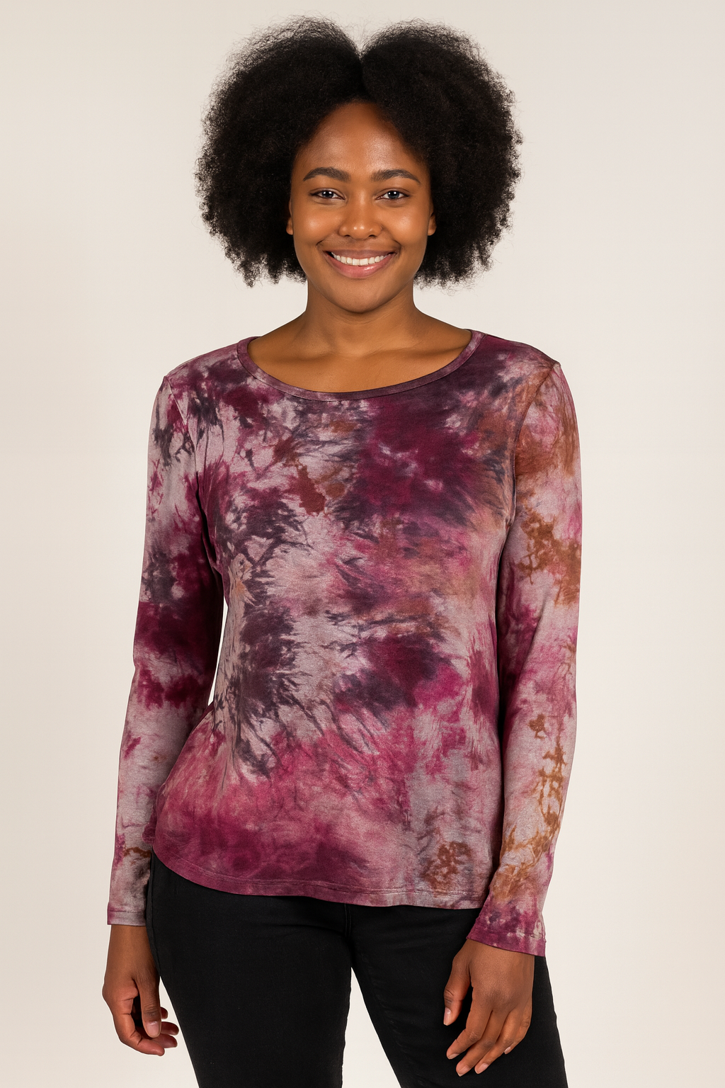 Jessie is a fitted long sleeve top ideal for autumn weather and layering. Showcasing our Raspberry Smash pattern.