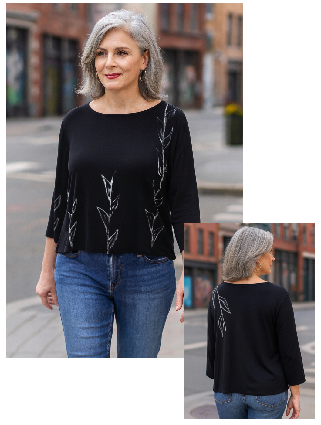 Betsy features a slight a-line cut that fits well on the shoulders. This top is designed to flatter the figure with a loose fit, shown in our Ivy pattern. Suitable for both casual and formal styling.